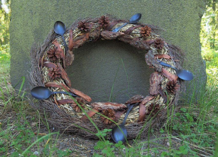 Jämsän muistomerkille laskettu seppele on päällystetty jäkälillä ja karveilla. Tein siihen pikkulusikoista ”krookuksen”, joka tässä symboloi uuden kevään ja kesän alkua ja niiden tuomaa toivoa uudesta satokaudesta.