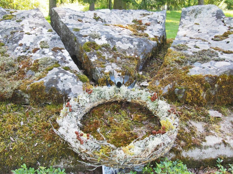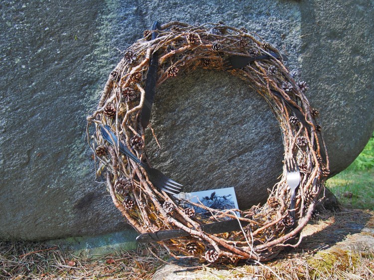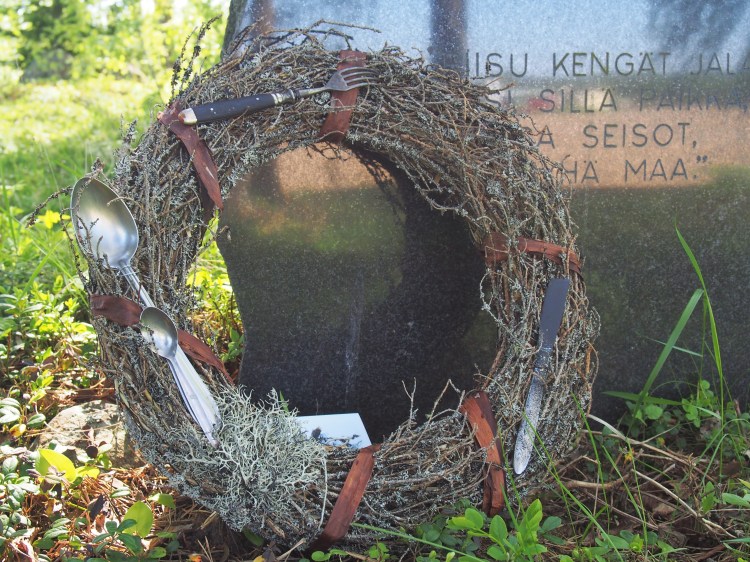 Kivijärven muistoseppele erilaisin jäkälälin ja sammalin, haavan ja kanervan oksin päällystettynä. Mustat ruokailuvälineet muodostavat pienen kimpun seppeleen kehälle.