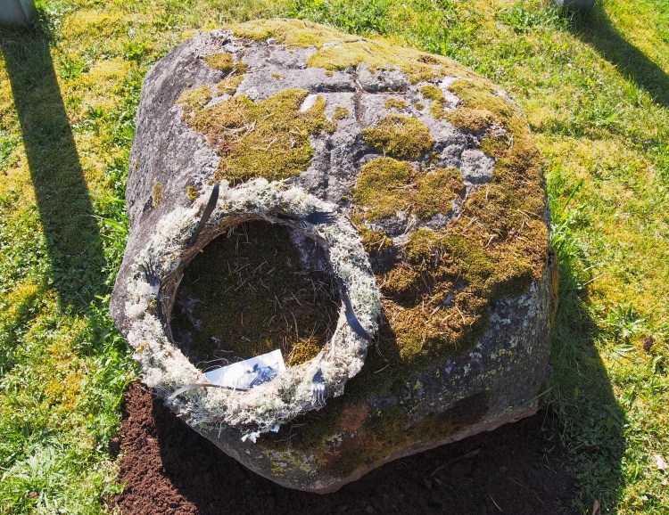 Sammaleet osin peittävät kiveen tehdyt kaiverrukset, vuosiluvun 1869 ja ristinmerkin.