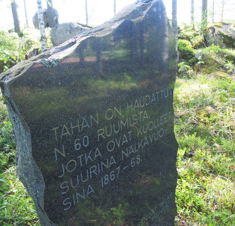 1860-luvulta oleva nälkävuosien muistomerkki löytyy Perhon kirkonmäeltä, Keski-Pohjanmaalta.