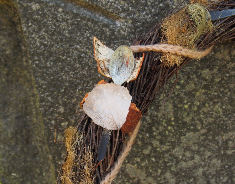 Lasten muistoseppeleen tein koivunoksista. Seppeleen kehälle asettelin pikkulusikoita, niiden ”pään” alle tuohityynyt ja ylivuotiset haavanlehdet peitteiksi. Virkattu villalanka kiertää seppelettä nauhana ja viittaa nälkävuosien käytäntöön teettää käsityötä ruoka-avun lunastamiseksi.
